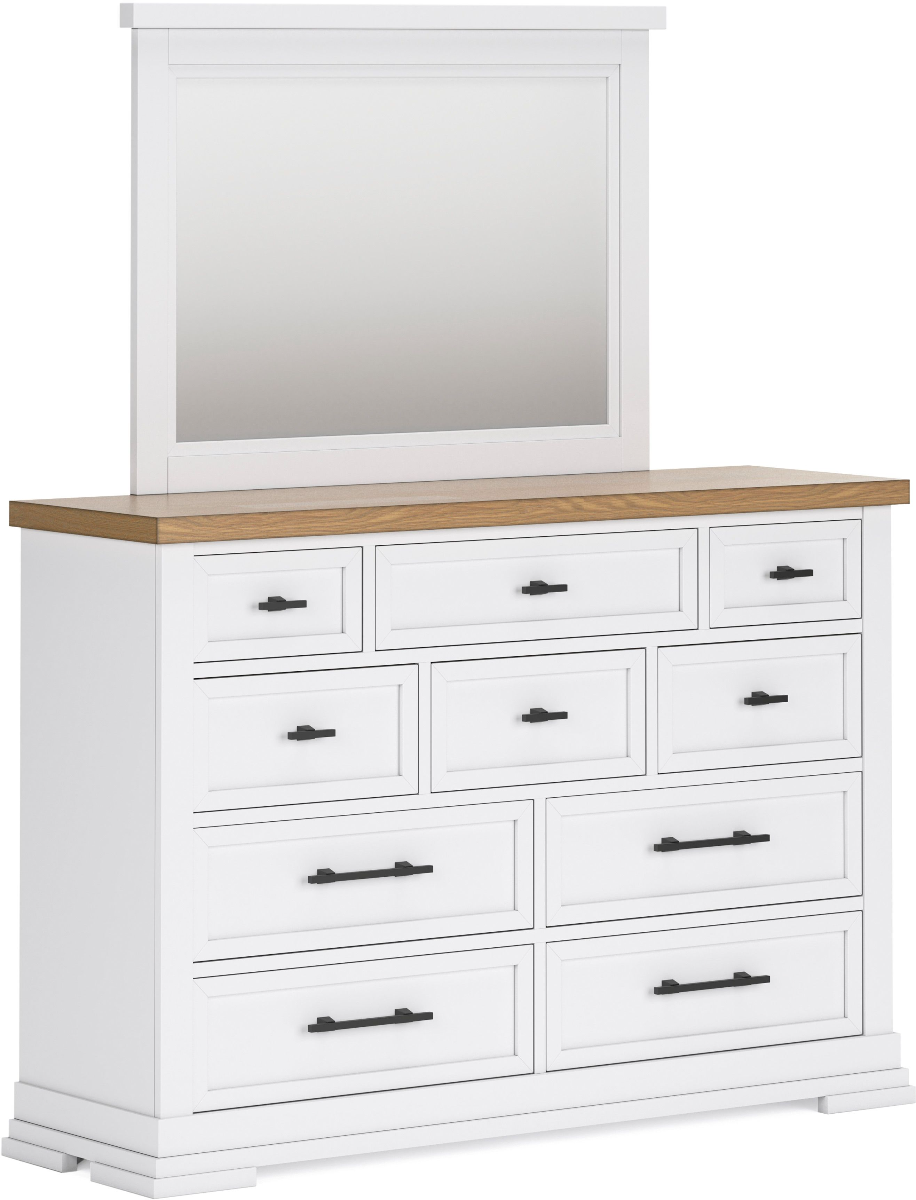 Casual style with substance. This two-tone dresser with mirror raises the bar on comfortably cozy design in your soothing sanctuary. A sturdy silhouette with a classic white finish and black metal hardware exudes modern farmhouse vibes. The butcher block oak veneer top adds a relaxed aesthetic.Read More