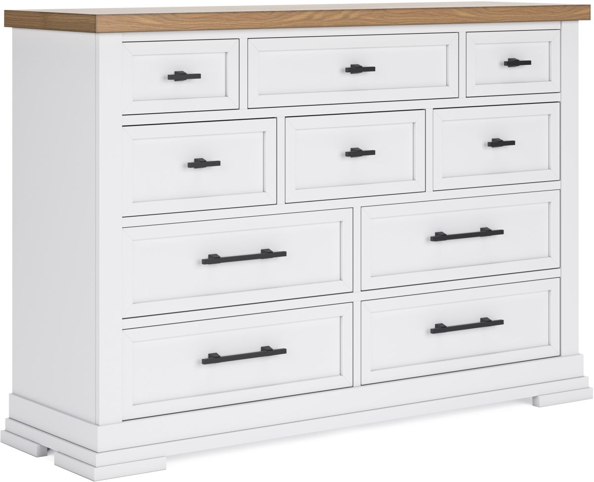 Casual style with substance. This two-tone dresser raises the bar on comfortably cozy design in your soothing sanctuary. A sturdy silhouette with a classic white finish and black metal hardware exudes modern farmhouse vibes. The butcher block oak veneer top adds a relaxed aesthetic.Read More
