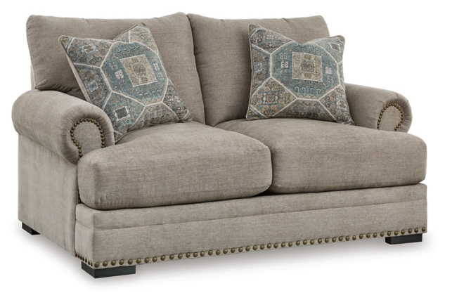 Looking to enhance your home's visual appeal? This loveseat offers sophisticated design, comfort and elegance with tonal colors, roll arms and nailhead accents. Enjoy optimal coziness as you nestle into luxurious soft upholstery and feather-blend cushions. Perfect for modern spaces, it's just the spot to sit back and relax in style.Read More