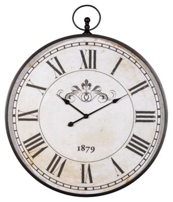 Embrace timeless elegance with the Augustina Wall Clock by Signature Design by Ashley. Its large Roman numerals stand out against a distressed cream finish, evoking cherished vintage charm. Crafted from metal with an antique black finish.Read More